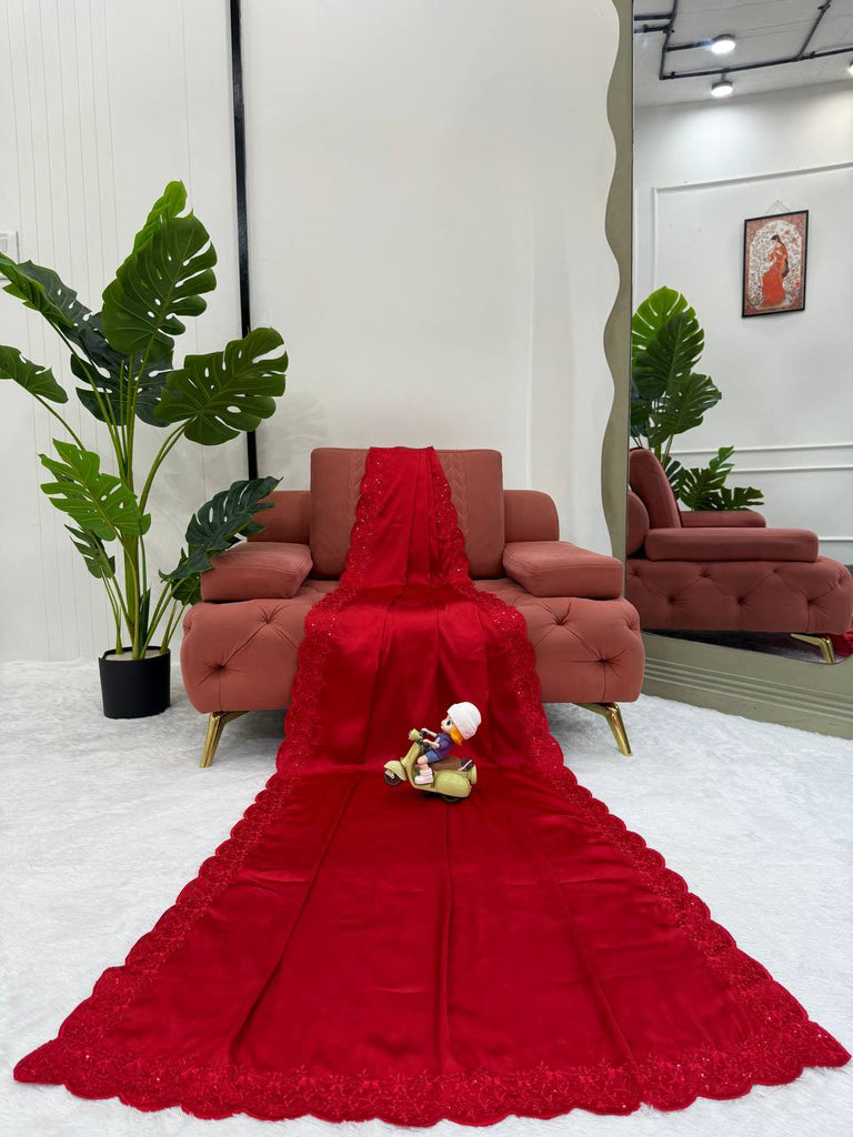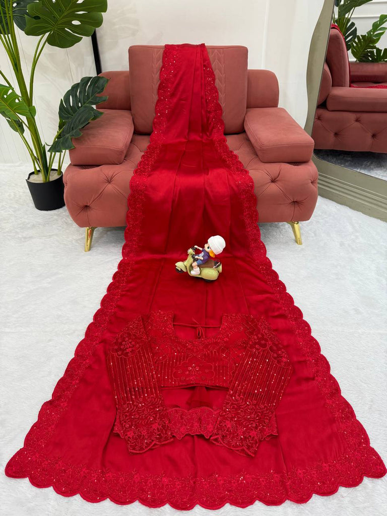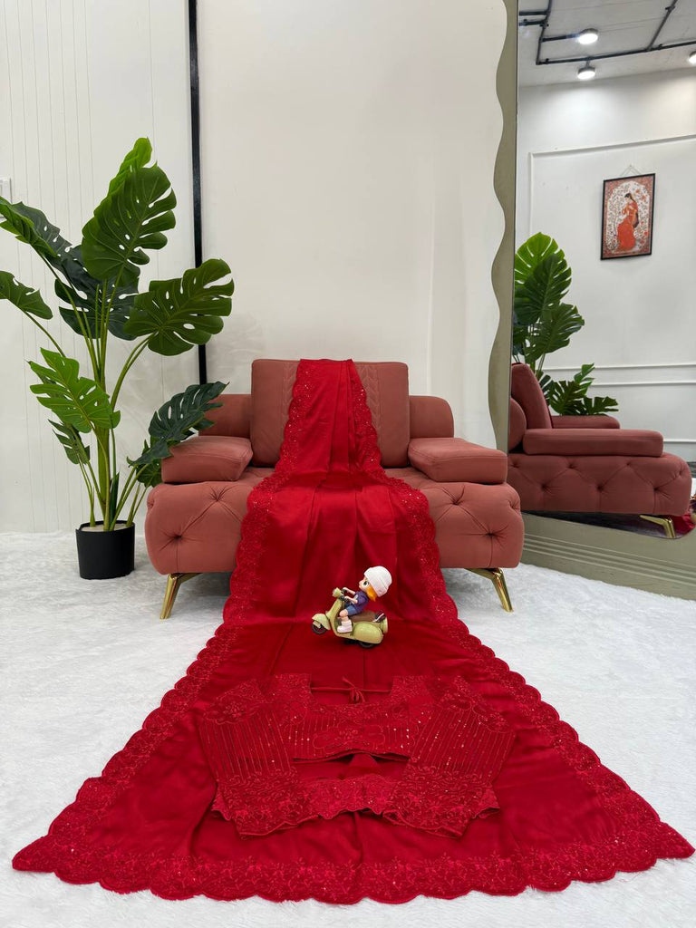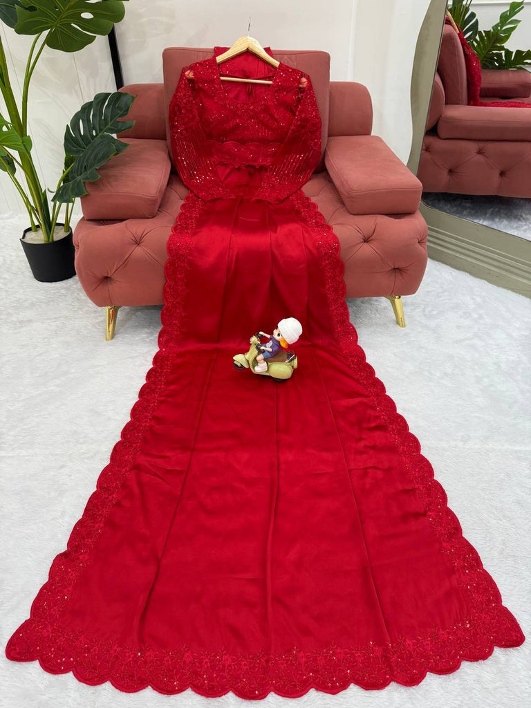 Party Wear RED Color Satin Silk Sequence Thread Work Saree Blouse