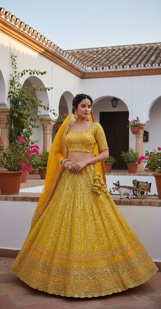 This beautiful semi-stitched lehenga choli set features intricate embroidery and sequin work on a luxurious Fox Georgette fabric, complete with a matching dupatta.