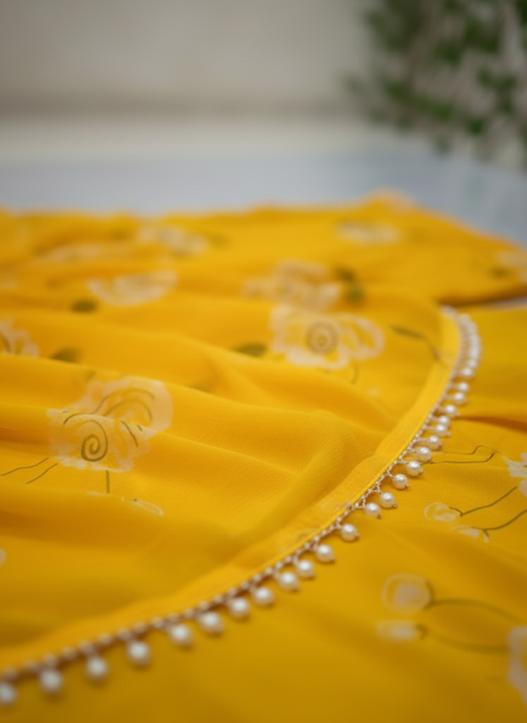 Attached Dupatta Premium Georgette with the same beautiful Digital Print and finished with a gorgeous Pearl Lace border.