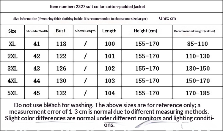 Sizes: XL (85–110 jin), 2XL (110–130 jin), 3XL (130–150 jin), 4XL (150–165 jin), 5XL (165–180 jin)