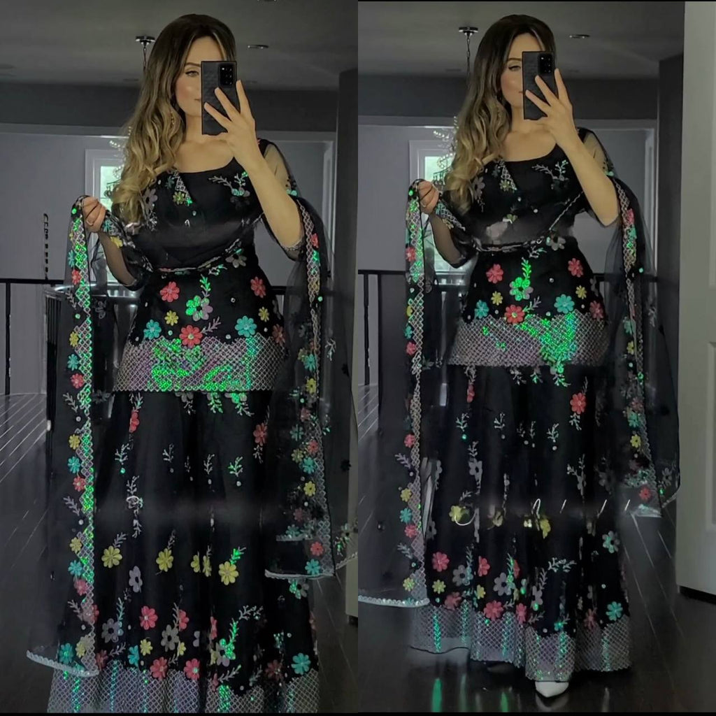 The heavy 5mm embroidery Rembo sequence work on the top, plazzo, and dupatta adds a touch of opulence to the set. The intricate details catch the light, creating a dazzling effect as you move.