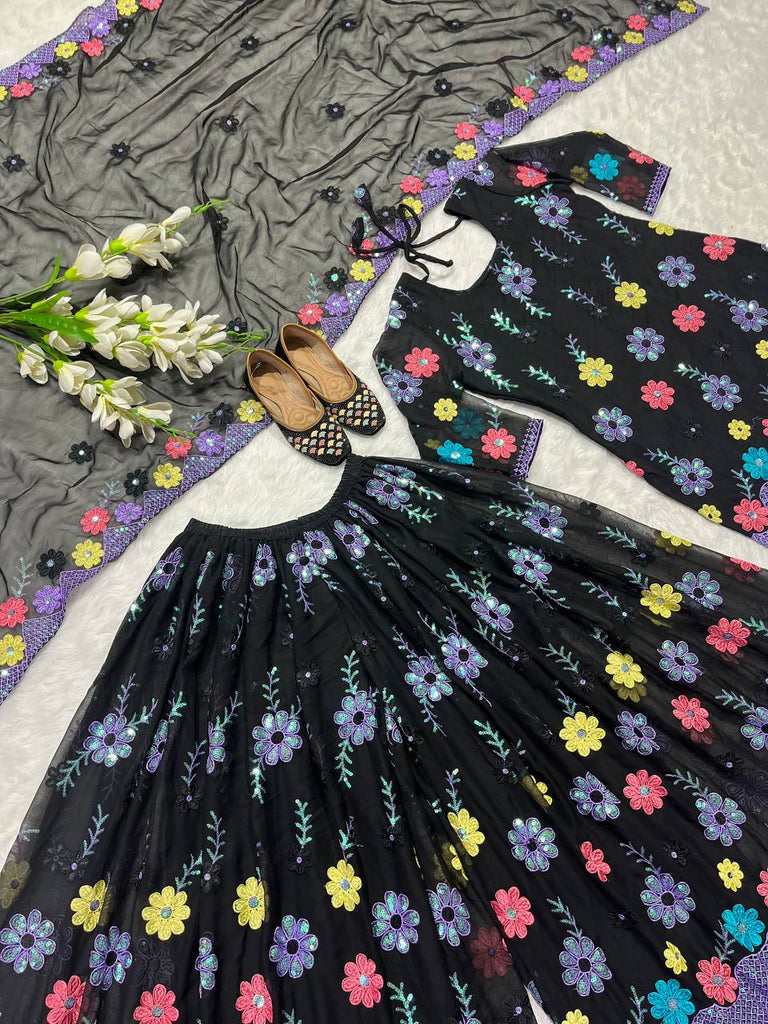π *Plazzo Fabrics* :Heavy Fuax Georgette With 5mm Embroidery Rembo Sequence With Fully Flair