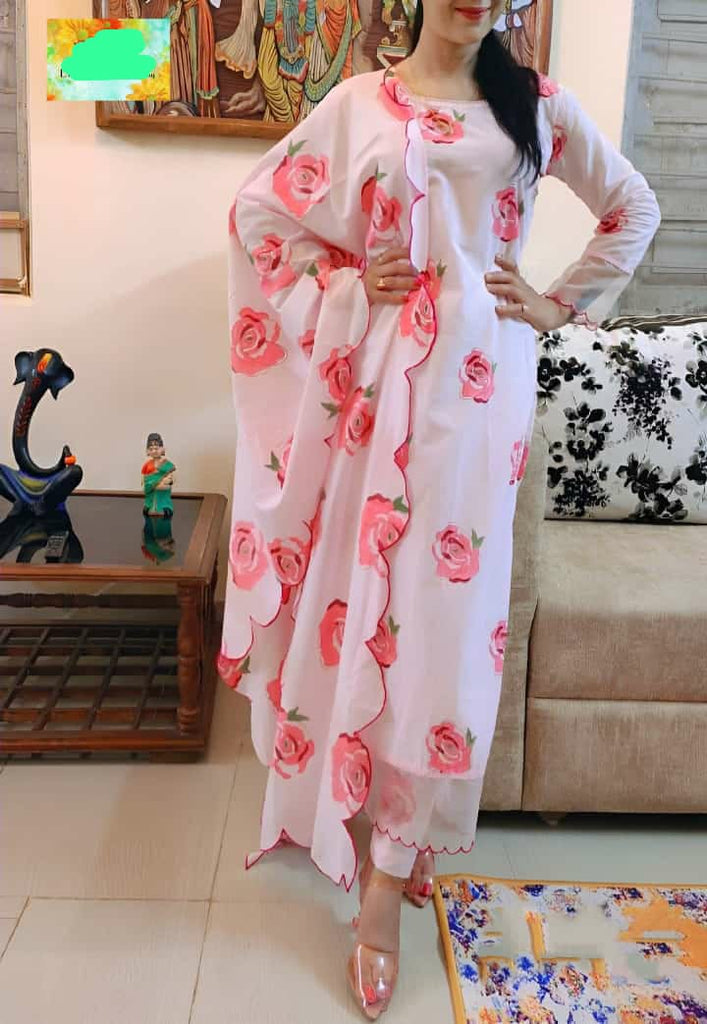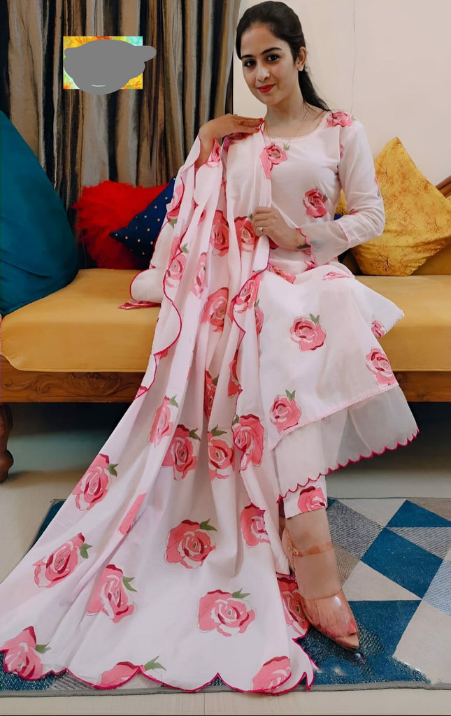 Beautiful Ready to Wear Suit with Rose Print done with SQURIEEL AARI WORKTechnique beautified with GEORGET BORDER on Kurti and Kurti Sleeves enhanced with Cutwork completing the Outfit with Cutwork Border Dupatta