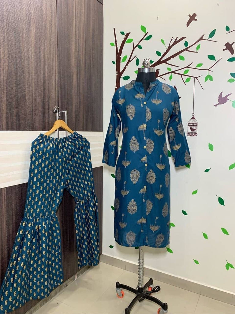 Amazaballs Rama Blue Color Rayon Golden Printed Full Stitched Kurti Plazo