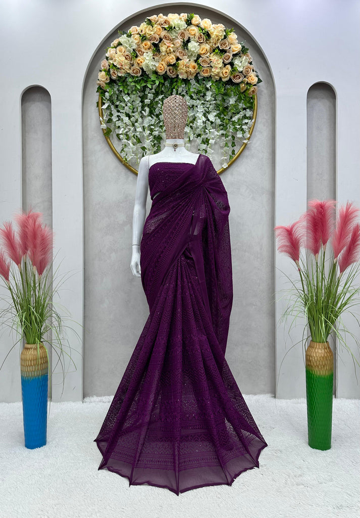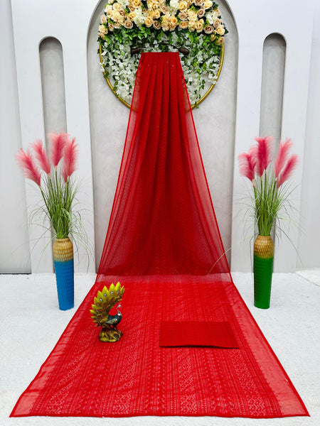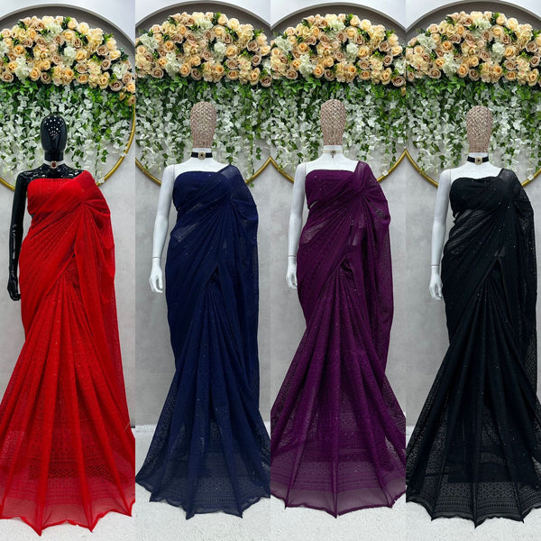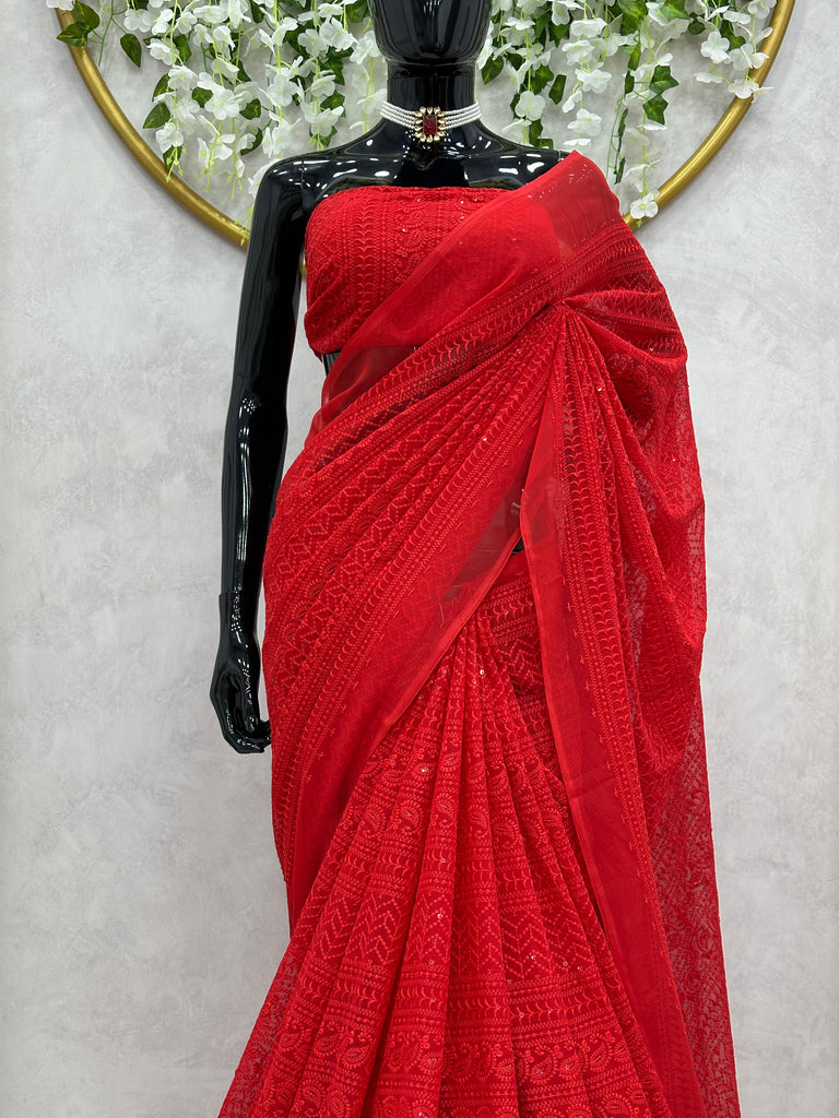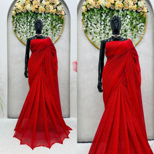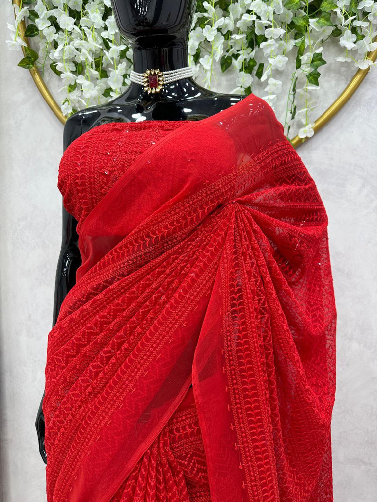 Attractive Red Color Georgette Thread Work Saree