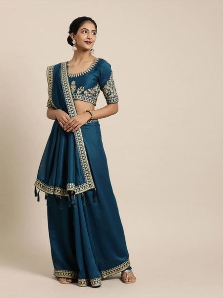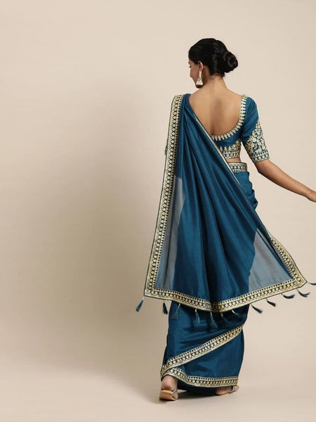 Classic Rama Blue Vichitra Silk Embroidered Work Fancy Saree Blouse