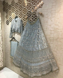 Dashing Grey Color Net Silk Embroidered Work Festival Wear Lehenga Choli Design