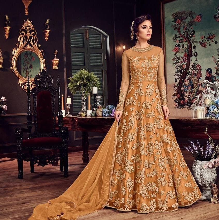 Desirable Mustard Color Wedding Wear Net Embroidered Work Salwar Suit
