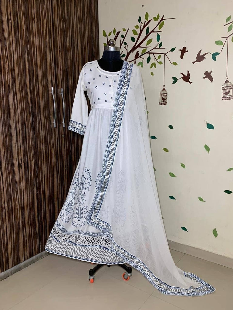 Enamoring White Color rayon Printed Ready Made Gown Dupatta For Ladies