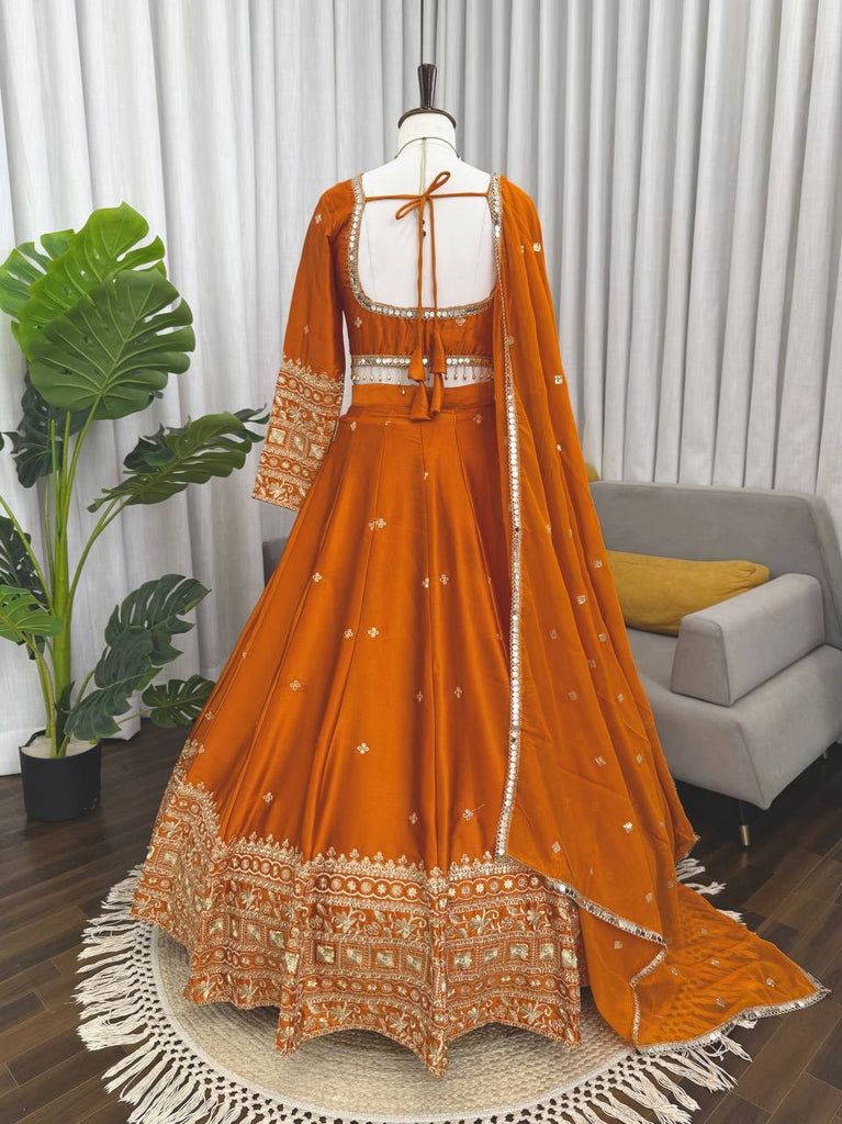 Elevate your ethnic wardrobe with this stunning Japan Satin Lehenga Set. Designed for grace and volume, this ensemble features intricate threadwork and shimmering sequence detailing, making it a perfect choice for weddings, receptions, and festive celebrations.