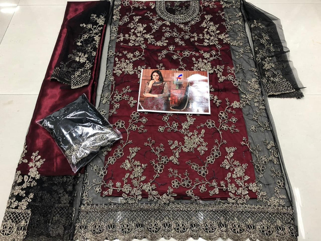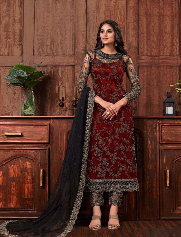Fantastic Maroon Color Net Sequence Coding Work Salwar Suit