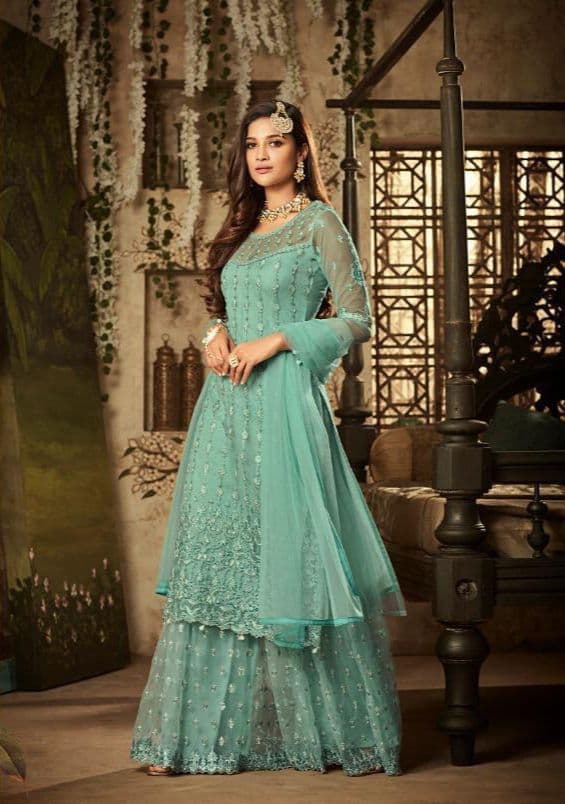 Fashionable Blue Color Net Embroidered Work Salwar Sui For Women