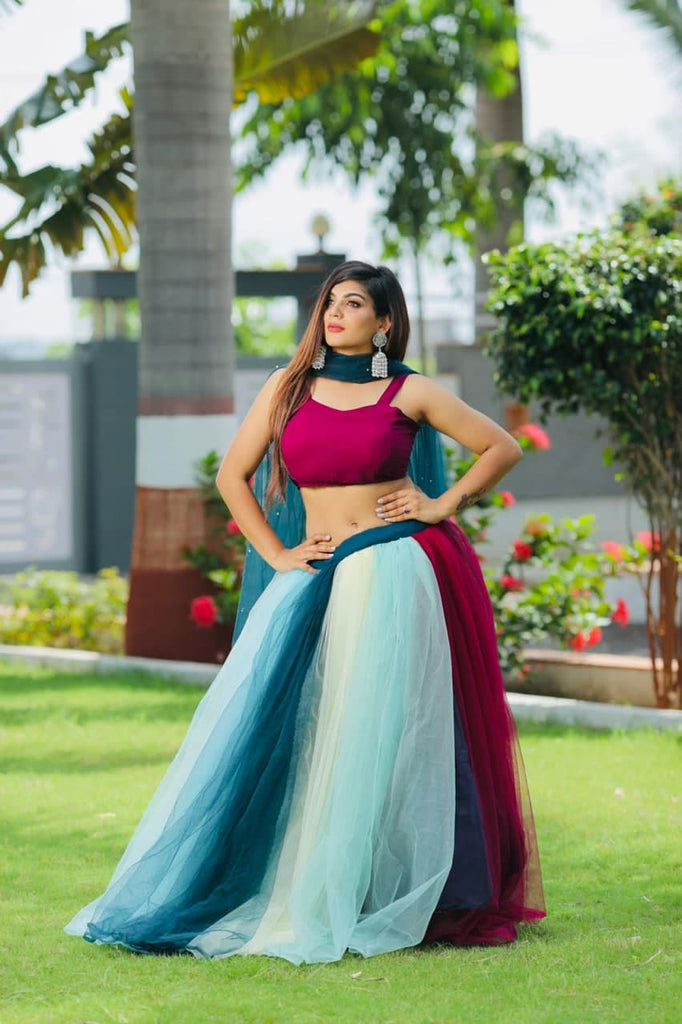 Magnetic Blue Color Net Wedding Wear Mother Daughter Lehnega Choli