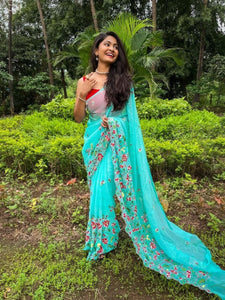 Mind-blowing Firozi Color Wedding Wear Georgette Embroidered Work Saree Blouse