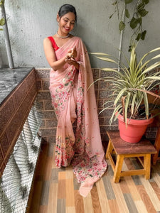 Pleasant Peach Color Georgette Casual Wear Embroidered Thread Work Saree Blouse