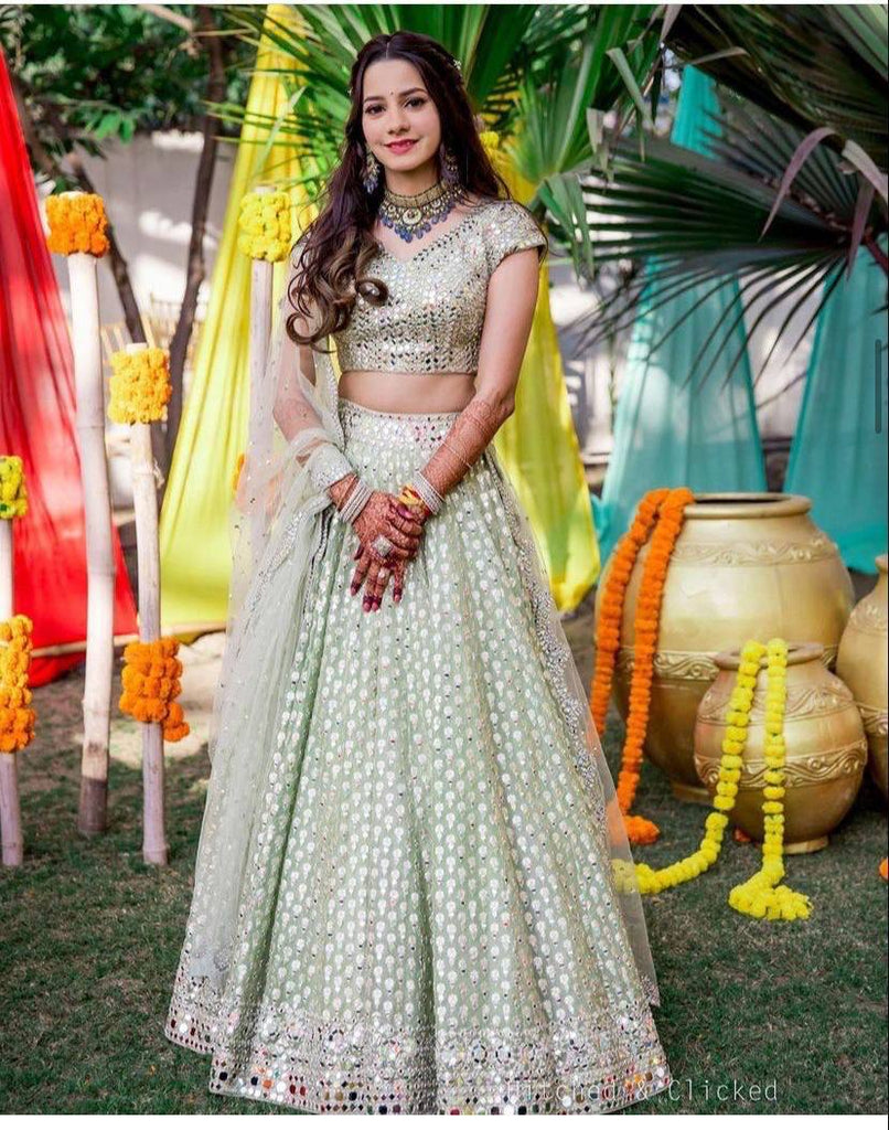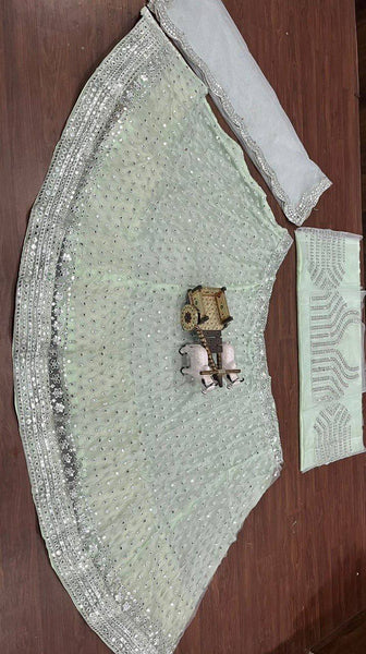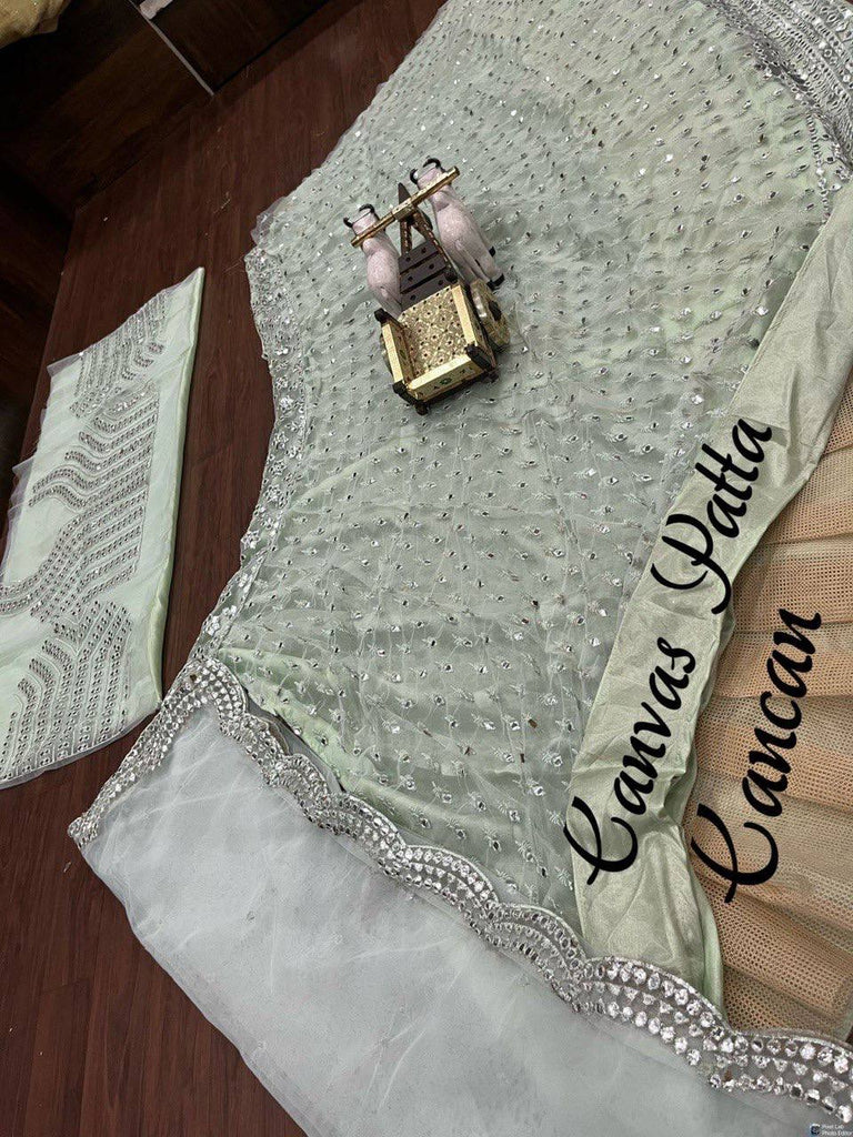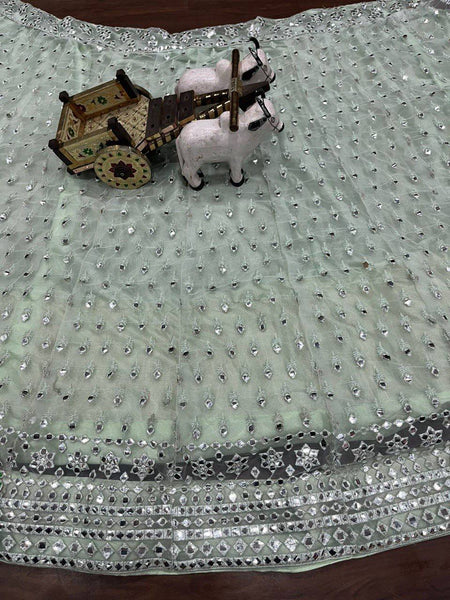 Sea Green Color 12 Kali around 3 Meter Soft Mono Net Foil Mirror Embroidered work Lehenga with Cancan