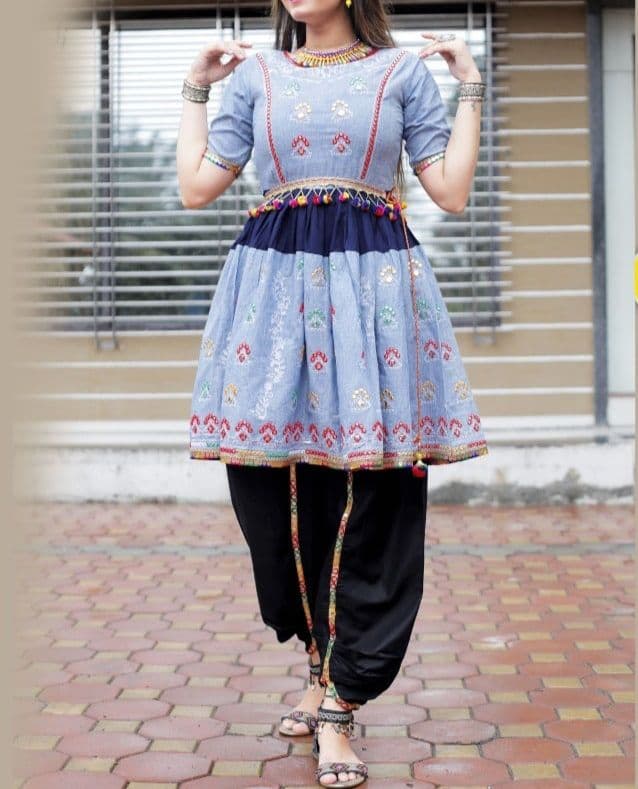 Smashing Blue Color Ready Made Mirror Work Cotton Dhoti Top For Ladies