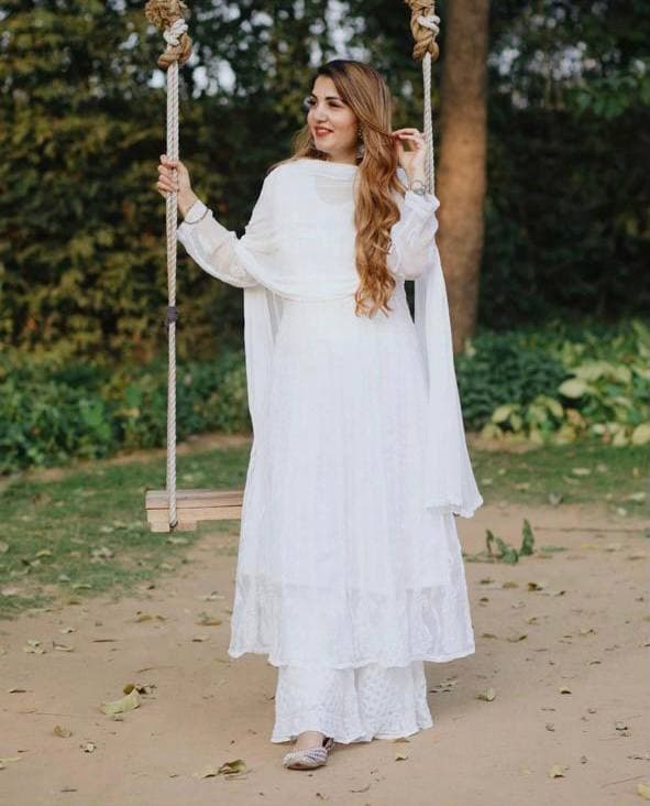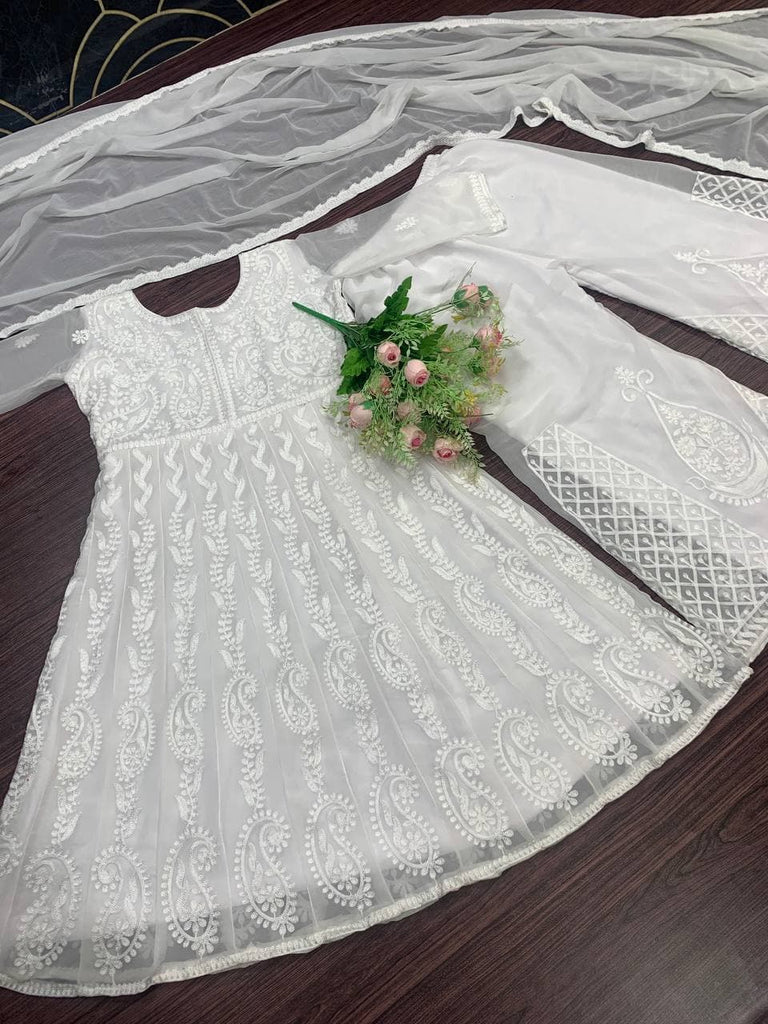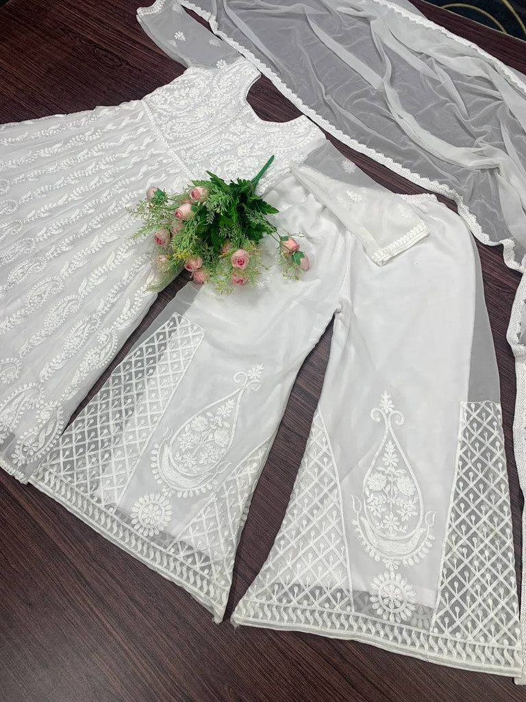 Stylish White Color Festive Wear Georgette Chine Stitched Work Plazo Suit